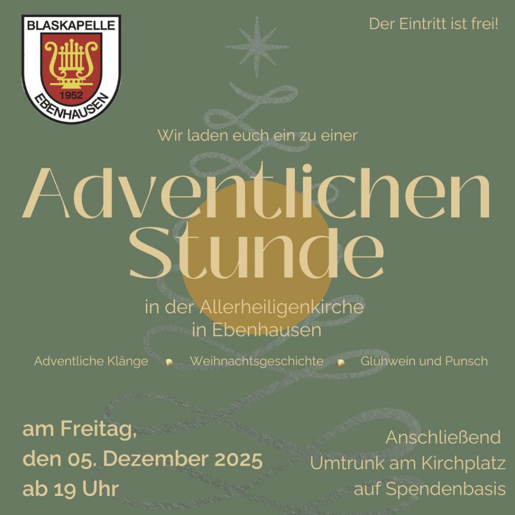 Wir laden euch ein zu einer adventlichen Stunde am Freitag, 05.12.2025, um 19:00 Uhr in der Allerheiligenkirche Ebenhausen. Freut euch auf adventliche Klänge sowie eine Weihnachtsgeschichte. Anschließend möchten wir mit euch den Abend bei einem Umtrunk am Kirchplatz auf Spendenbasis ausklingen lassen. Der Eintritt ist frei.