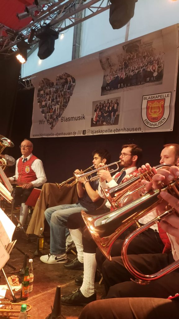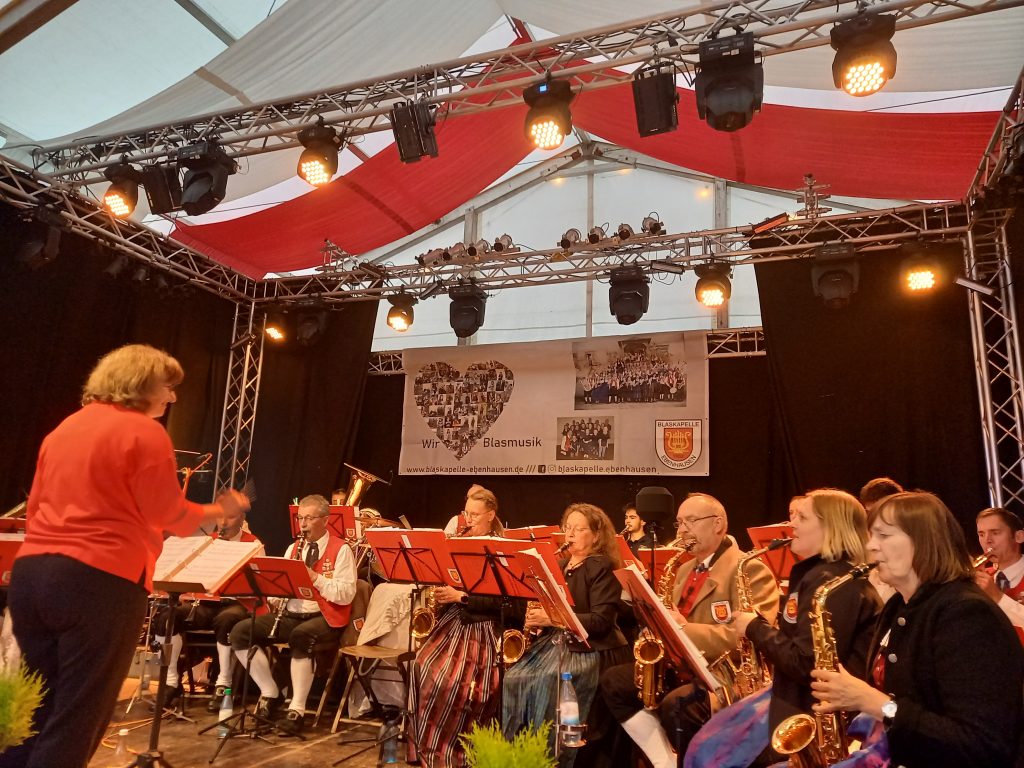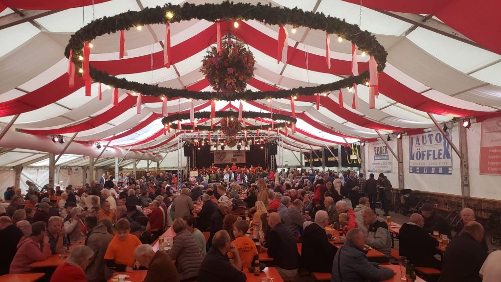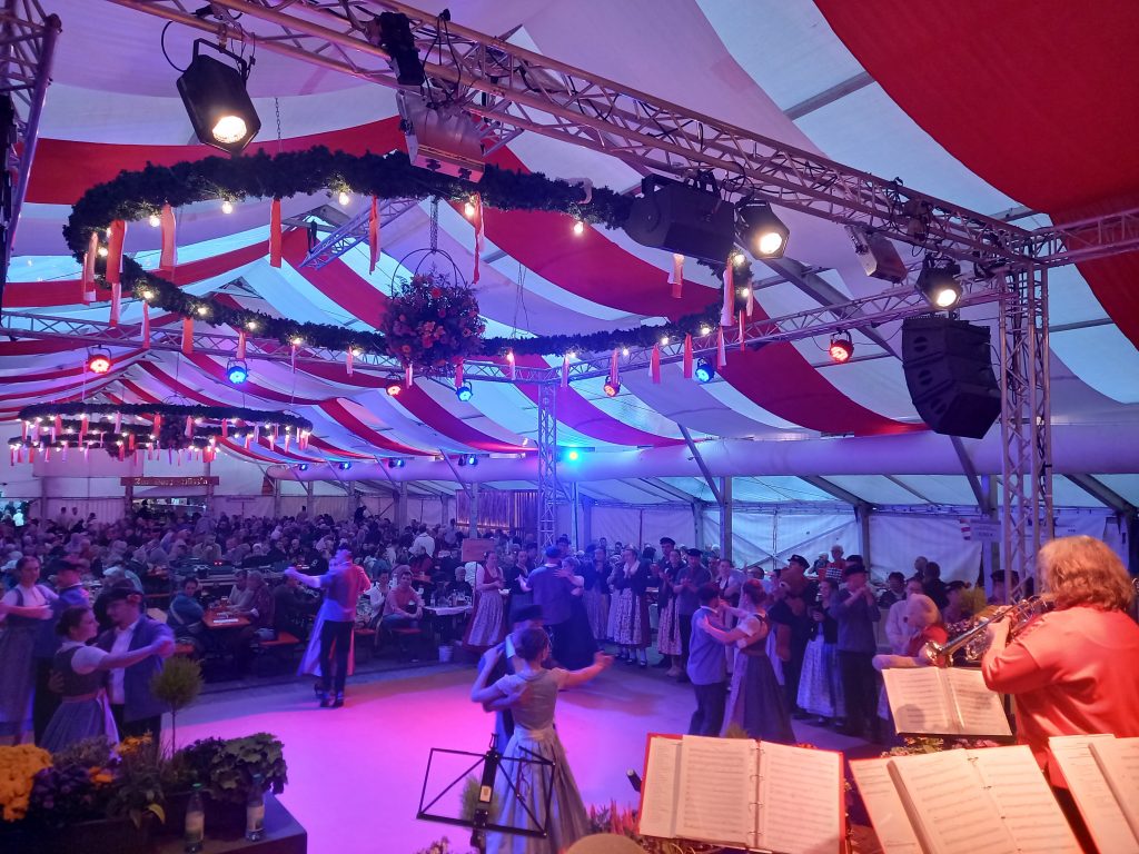 Trotz ungewohnter Startzeit – Montag ab 14:00 Uhr – bekamen wir eine gute Truppe für den Familiennachmittag an der Kirchweih Grafenrheinfeld zusammen. Gespickt wurde das Programm dabei mit Blöcken fränkischer Tanzmusik für die Rafelder Planpaare. Für einen Montag-Nachmittag war das Zelt erstaunlich gut gefüllt, sodass sich die Schlange für das Kesselfleischessen einmal quer über die Tanzfläche und an unserer Bühne entlang staute. Nach rund vier Stunden Auftritt durften dann auch einige Musiker ihre zuvor reservierte Portion genießen. Ein besonderer Dank geht an dieser Stelle noch an zwei Personen – zum einen an Christian, welcher uns hervorragend mit Ton und Technik unterstütze sowie zum anderen an Interims-Dirigentin Christine, welche sich glücklicherweise bereit erklärt hatte, unseren verletzten Jürgen zu vertreten.