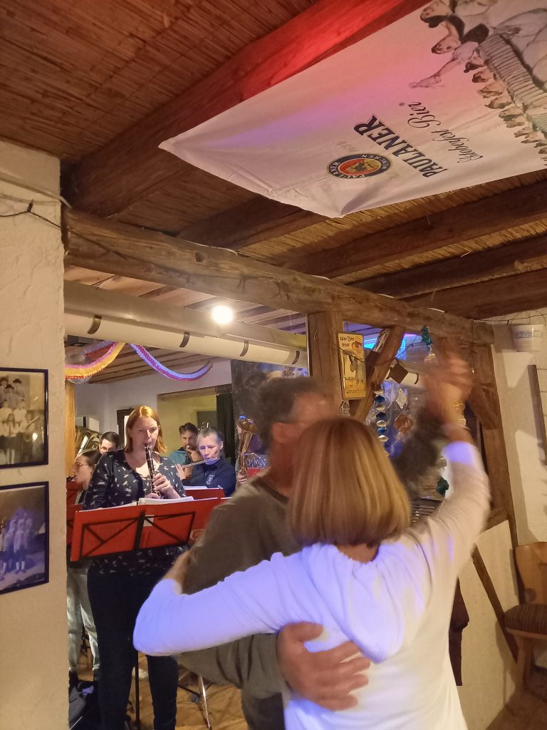 Nach der Generalprobe für das Kirchenkonzert ging es für uns gleich weiter in den Partykeller der Familie Dees. Das Ständchen zum 65. Geburtstag hatte sich Dagmar in vielerlei Hinsicht absolut verdient. Sie ist bereits seit über 40 Jahren Mitglied und als fleißige Helferin bei unseren Veranstaltungen häufiger anwesend, als so mancher Musiker. Zudem hatte ihr 60. Geburtstag coronabedingt leider entfallen müssen. Mit Recht hatte Dagmar daher eine große Wunschliste an Stücken vorbereitet, welche wir gerne „abarbeiteten“ – ein Tänzchen durfte dabei selbstverständlich nicht fehlen. Nach der Geschenkübergabe durch Vorstand und Sohn Matthias waren auch wir noch zum Mitfeiern eingeladen.